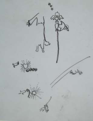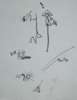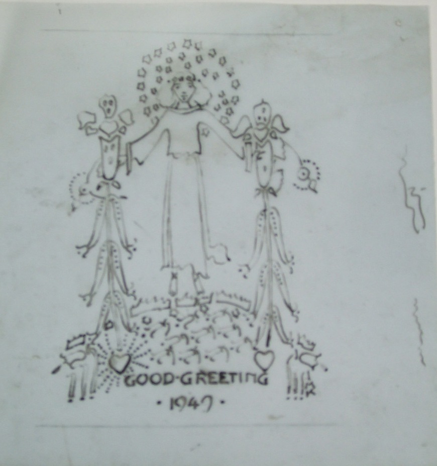 pen & ink, watercolour, inscribed GOOD GREETING/ 1949, with ink sketch verso, 12cm x 9cm; also STUDY FOR 'GOOD GREETING', pen and ink on acetate, inscribed GOOD GREETING/ 1949, initialled JMK, 14cm x 13cm; and a SHEET OF PREPARATORY STUDIES, pen and ink on acetate, unsigned, 18cm x 15cm (3)