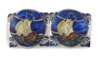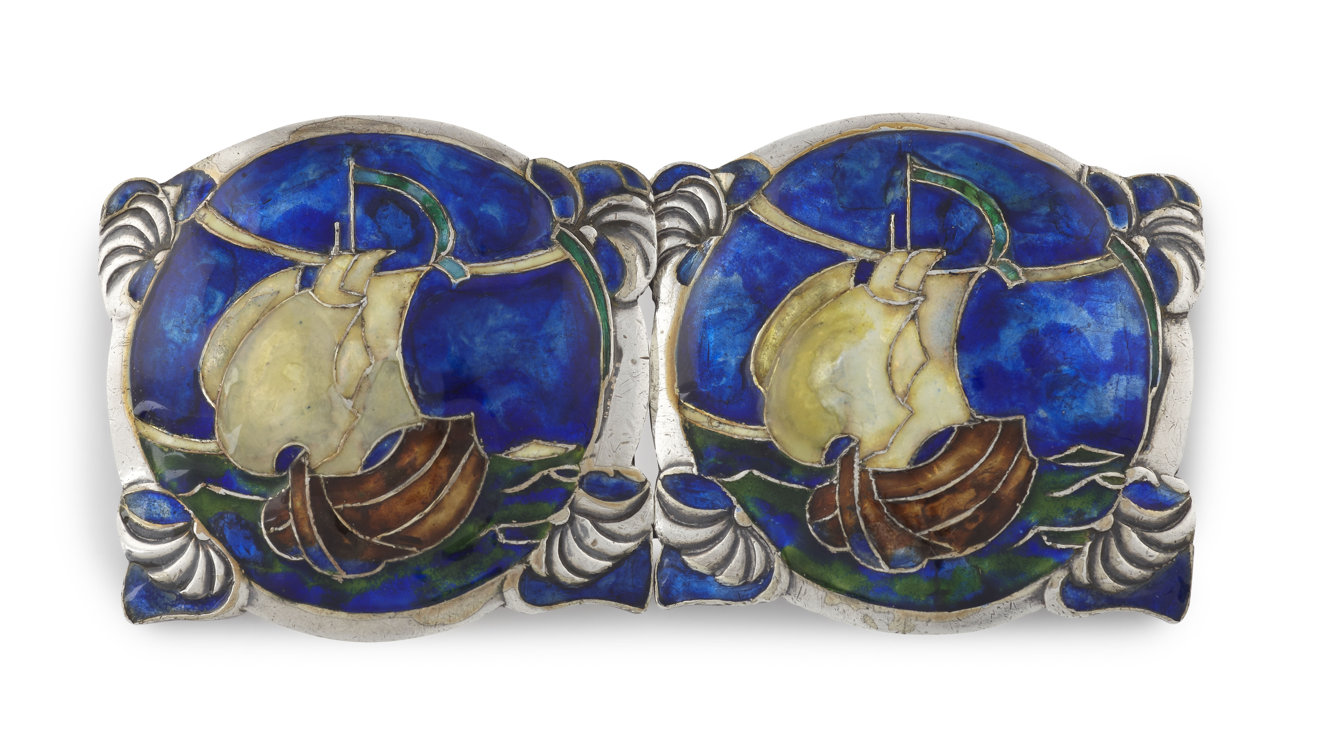 the buckle in two parts, each with circular cloisonné enamel panel depicting a longboat in full sail, makers mark L&CO, stamped number 10197, hallmarked Birmingham 1910
