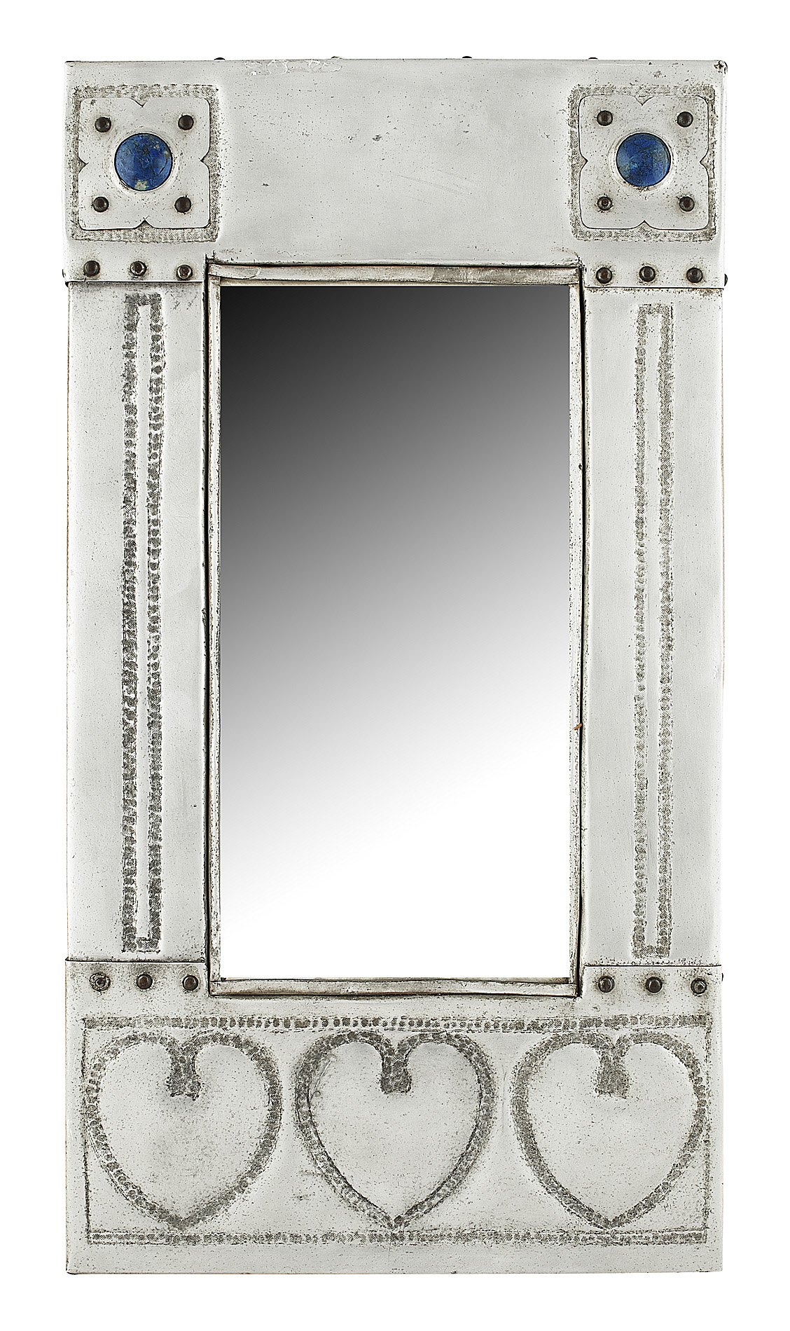 of rectangular outline, repoussé decorated with a frieze of heart motifs and set with blue stone cabochons