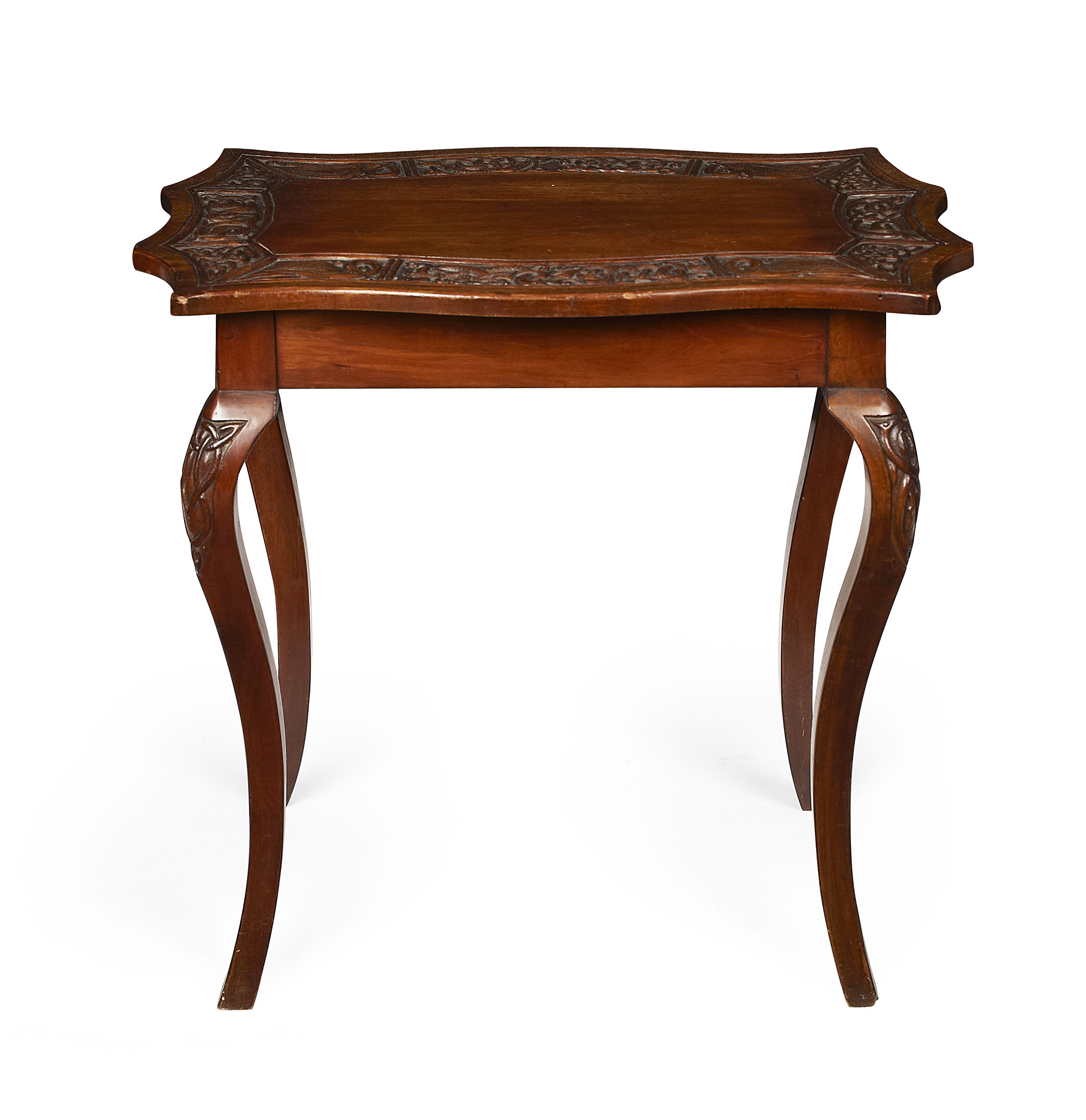 the serpentine rectangular top, carved in bas relief with a band of Celtic beasts and knotwork, raised above a plain frieze and square tapered cabriole legs with carved knees