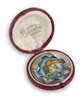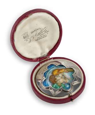 Note: Traquair started working in enamels whilst staying at Castlecraig in Peeblesshire, the home of Lord and Lady Gibson Carmichael. Lady Carmichael had studied with Alexander Fisher, and was already creating works in the art and had an enamelling workshop. Initially her work was based on the historic enamels she had studied in the Carmichaels extensive collections, and indeed she collaborated with Carmichaels on several works. By 1902 she had begun to produce enamels in her own style, and had become skilled at handling minerals and firing temperatures, attempting a wide range of work and mixing the spiritual and secular. The present lot, dated to around 1903, share its subject with a triptych of the same date, and demonstrates Traquair's mastery of the medium, with its embossed surface, glowing colours and finely painted surface. Traquair exhibited twenty-two enamels at the Arts & Crafts exhibition in London, including a pendant of similar form to the present lot, commissioned by Sir Robert Lorimer, with whom she would collaborate on a number of projects in later years.