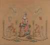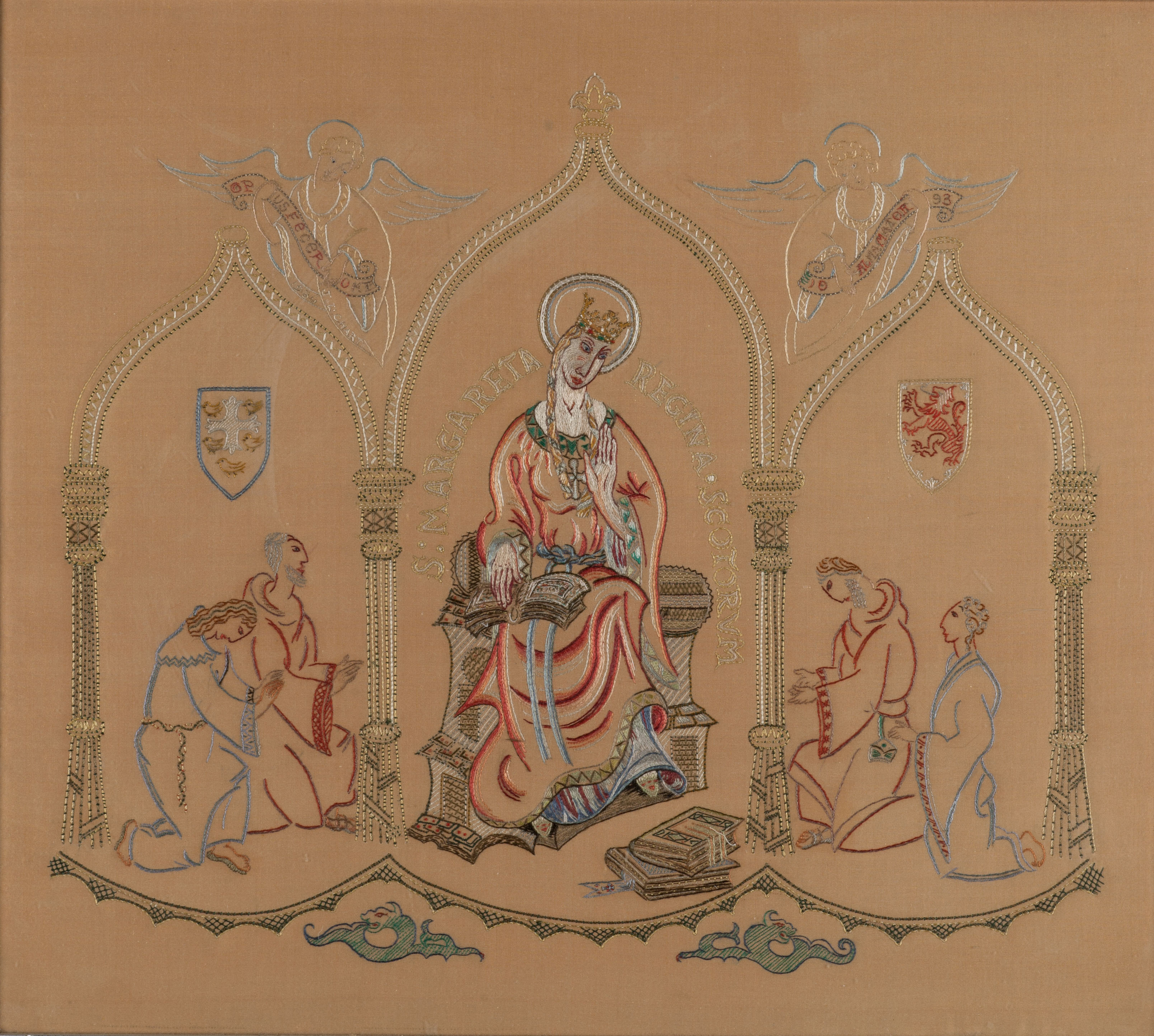worked with coloured silks on a buff lined ground and bearing embroidered inscription S: MARGARETA: REGINA: SCOTORUM, bears label verso