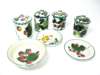 'PLUMS' PRESERVE JAR & COVER; and 'CHERRIES' PRESERVE JAR & COVER, each with later Griselda Hill covers, each with painted or impressed maker's marks, approx., 13cm high; a WEMYSS WARE 'STRAWBERRIES' MEDIUM PRESERVE JAR AND COVER, EARLY 20TH CENTURY, decorated by Joe Nekola, painted mark WEMYSS, 13cm high; 'BUTTERCUPS' SAUCER, impressed mark WEMYSS, printed retailer's mark, 13cm diameter; 'STRAWBERRIES' BOWL, impressed mark WEMYSS, restored, 14.5cm diameter; 'RASPBERRIES' SMALL PLATE, impressed mark WEMYSS, hairline, 14cm diameter (7)