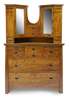 decorated with chevron banding, the surmount with opposing mirrored doors centred by two drawers, above a rectangular top and an arrangement of four short over two long drawers, each with cut out handles and beaten silvered backplates, the whole raised on bracket feet, label aperture to rear (label now lacking)