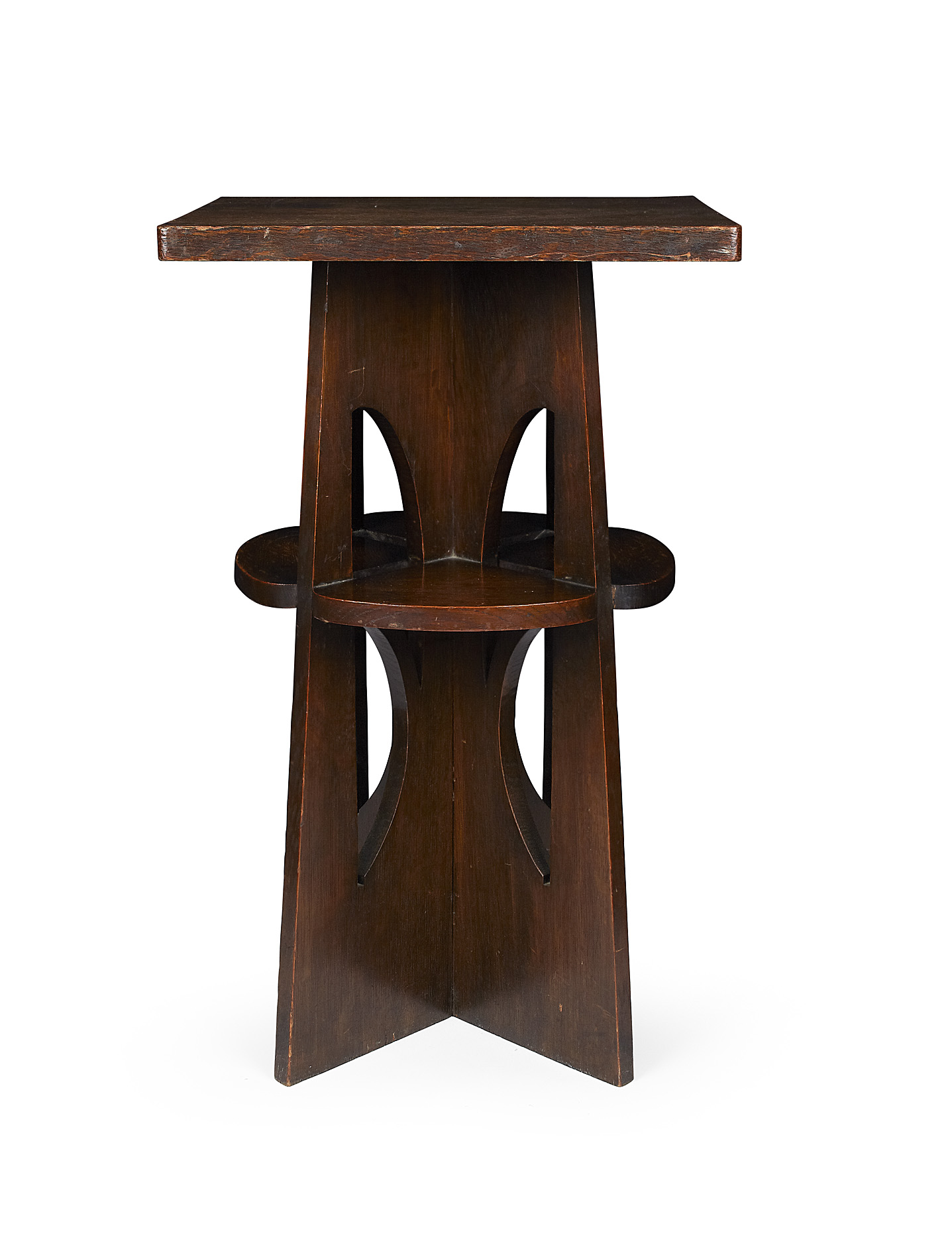 the square top above crossed supports tapering to a wide base and pierced, centred by a quatrefoil-shelved tier