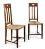 with pierced top rail and slatted backs raised above rush seats on square tapering legs linked by stretchers (2)