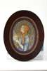 worked in coloured silks with the 3/4 length figure of a girl holding flowers, her flowing blue robes with gilt beaded embellishments, framed and glazed