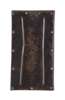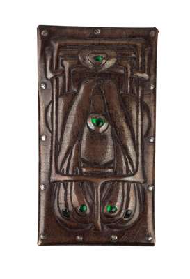 patinated copper and green glass, of rectangular outline, repoussé decorated with opposed birds on a stylised foliate ground, set with cabochon stones and bordered with a rivet decoration, contained within fitted leather case (2)