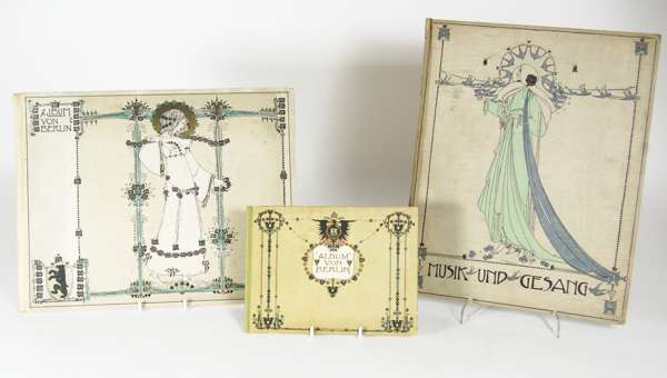 Berlin, 1899. Upper board only, appox. 28 by 35cm; [Idem] Album von Berlin. Berlin, c.1900. Boards only, 15 by 20cm; [Idem] The book of bridges. London, 1911. 8vo, plates, original green cloth gilt; [Idem] A selection of 13 colour plates by King, loose, each approx. 25 by 20cm; [Idem] Musik and gesang. Boards only, approx. 34 by 27cm; [Proofs] Three cover proofs for Petite collection d'histoire naturelle, ink notes, heavy foxing and folds; The Studio one plate from The Studio magazine, approx. 30 by 20cm; and 3 books (qty)