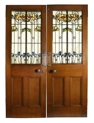 each with two stained and leaded glass panels depicting stylised flowers, the panelled doors with embossed brass handles and copper fingerplates (2)