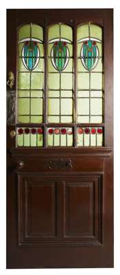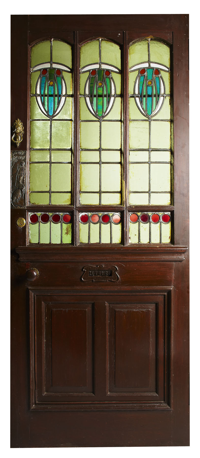 the overpainted panel door with associated brass fittings, inset with three Glasgow Style stained and leaded glass panels, each representing stylised linear plant forms