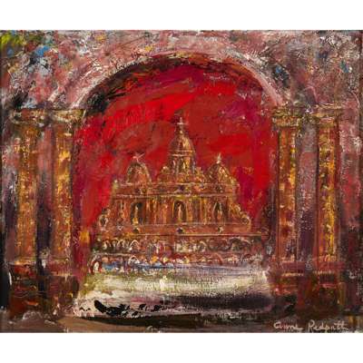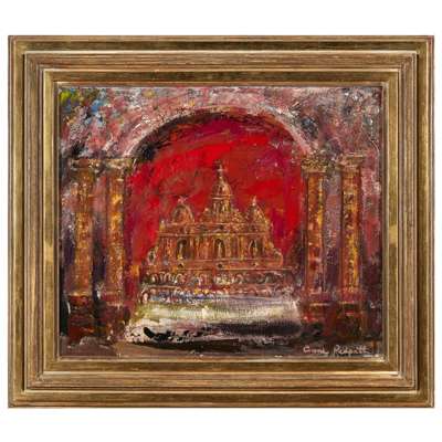 In October 1920, Redpath married architect James Beattie Michie and moved to France where she continued to paint, though much of her life became devoted to raising her three sons: Alastair, Lindsay and David. Painted during her time in France, Windmills at the Pas de Calais is a fine example of one of Redpath’s favourite subjects. The scene is bright, fresh and sunny; an Impressionist influence can be seen in her application of colour and texture. In contrast, Mediterranean Village is an example of Redpath’s later work. Deliberate splashes and scratches of white paint renders the scene more abstract, but no less beautiful. In In a Church, St. Paul, her brushwork becomes intricate, layered and focused in its application to reveal a symphony of detail, with Redpath utilising visible texture to emphasise the surface of the building itself.