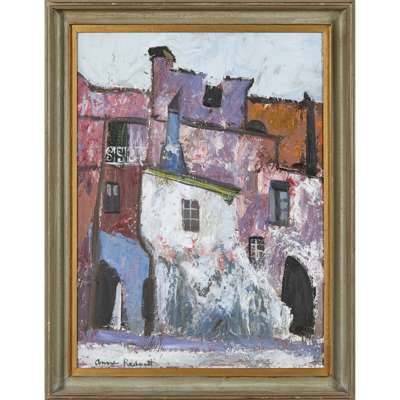 In October 1920, Redpath married architect James Beattie Michie and moved to France where she continued to paint, though much of her life became devoted to raising her three sons: Alastair, Lindsay and David. Painted during her time in France, Windmills at the Pas de Calais is a fine example of one of Redpath’s favourite subjects. The scene is bright, fresh and sunny; an Impressionist influence can be seen in her application of colour and texture. In contrast, Mediterranean Village is an example of Redpath’s later work. Deliberate splashes and scratches of white paint renders the scene more abstract, but no less beautiful. In In a Church, St. Paul, her brushwork becomes intricate, layered and focused in its application to reveal a symphony of detail, with Redpath utilising visible texture to emphasise the surface of the building itself.