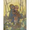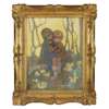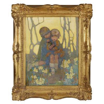 Sisters with Kitten brings the essence of Gray’s portraiture together with bold colours, flowers and strong contrasts. She has the full attention of the cherub-like children who sit in a wooded scene amongst flowers that blend seamlessly into a bright yellow background. The background light shining on the sitter’s head simulates sunset and creates a halo effect, drawing one’s attention to the expression of the child in the yellow dress tightly clutching the kitten in her arms. A wonderfully talented portraitist and Sisters with Kitten epitomises Gray’s superb handling of paint and use of bold colour.