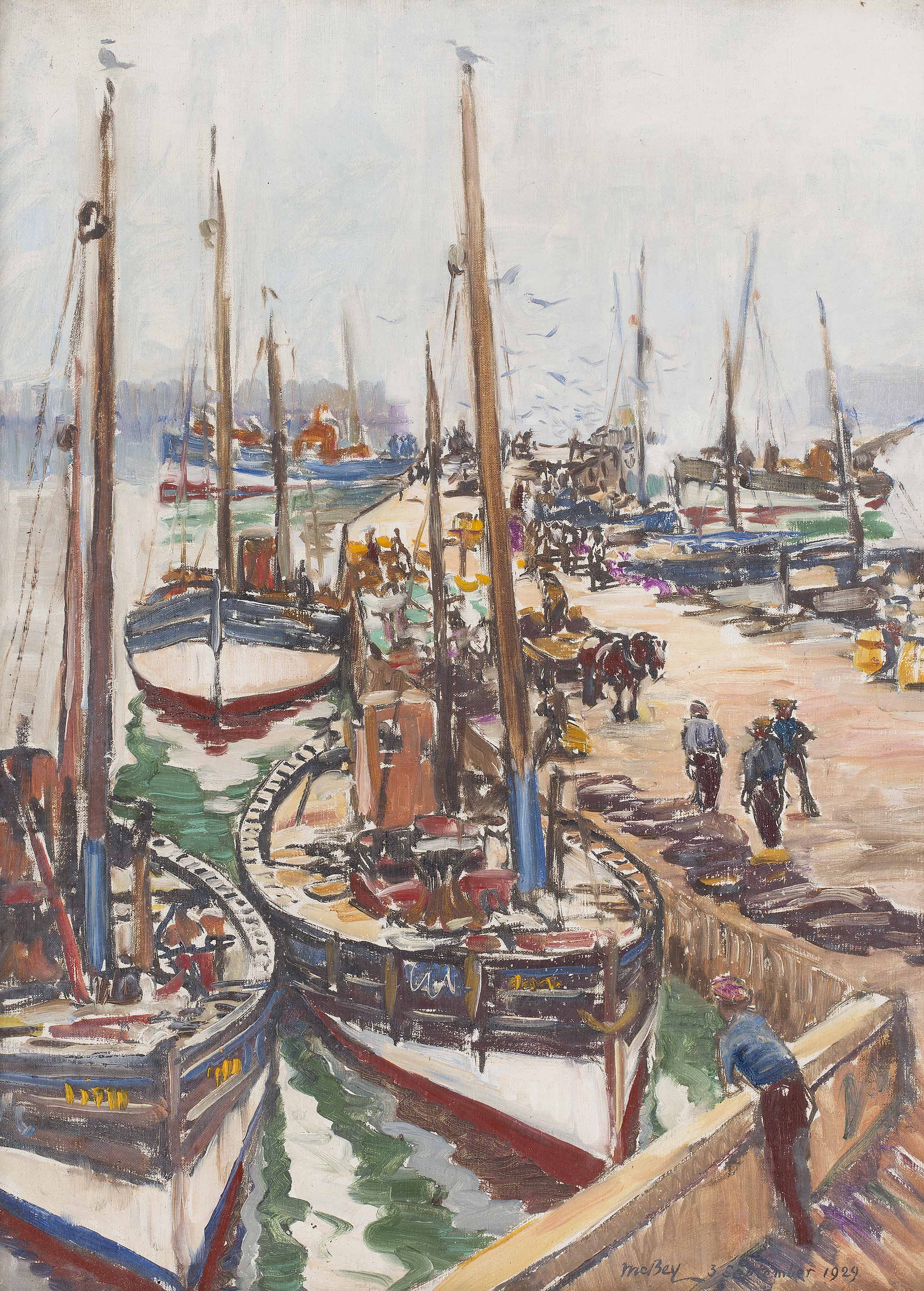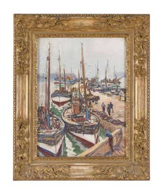 On the 2nd of September 1929 McBey painted the quiet quay at Pittenweem. The following day he moved two miles south to paint the lively fishing village at St. Monance. Both depictions of the picturesque harbour towns are offered here, having remained in a family collection for three generations.