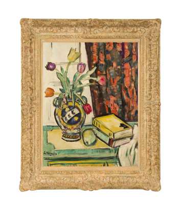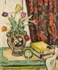 STILL LIFE: BOOKS AND A PEAR AND TULIPS IN A VASE