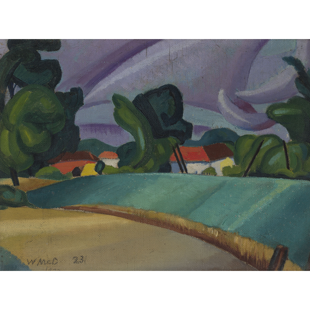 The landscapes shown here are early examples of McCance's boundary-pushing work; Movement in a Landscape dates to 1923, produced a year after the first recorded example of his artworks in this manner. His landscapes have been described as "aggressive" and here there is certainly something somewhat violent to the juxtaposition of vivid colours, as well as a sharp, edgy angularity to the shapes which make up his compositional structure.