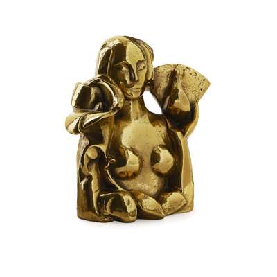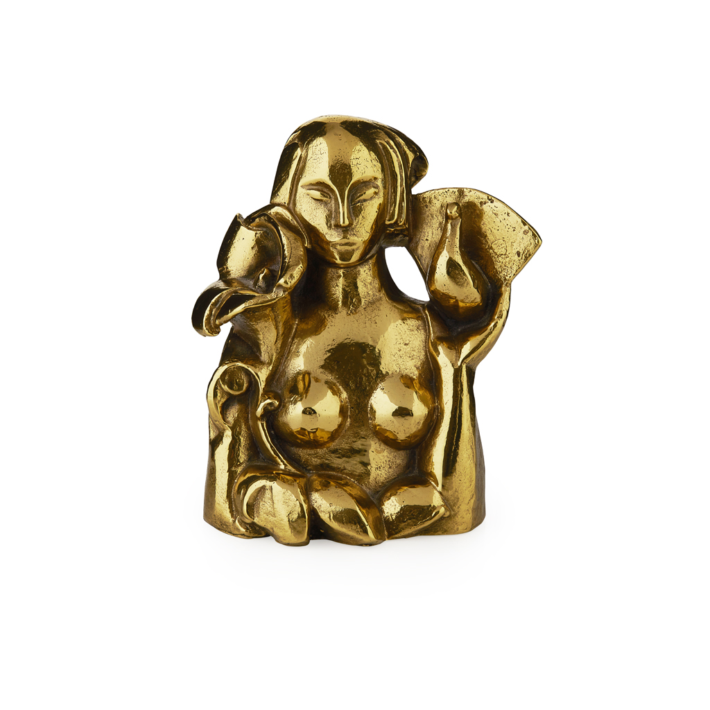 Sculpture was something that Fergusson dabbled in throughout his career and is an important part of his oeuvre, demonstrating his distinctive artistic identity and talent. Philosophy, a stylised female figure glowing golden with a flourish of flowers blooming out of one side and a single geometric bird balancing on her other hand and shoulder, is strikingly modern yet has a timeless quality.
