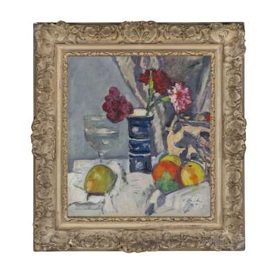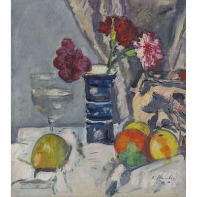 A Still Life of Roses and Fruit, is typical of Hunter's work of the mid 1920s, using a backdrop of drapery and with the foreground objects set on a table, angled towards the viewer. By this date Hunter has moved away from the predominating Dutch influence of his early still-lifes, with their dark backgrounds and jewel-like fruit and there is a tendency to abandon perspective and group the objects as arrangements on a single plane. He has yet however, to embrace the full-blown Cloissonism of the very late still-lifes.