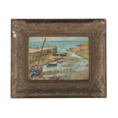 Of the two works on offer here, Boats in Harbour has a distinctly French, Post-Impressionist flavour, being reminiscent of Van Gogh, particularly in tone and colouring. We know from Honeyman's biography that Hunter had a notebook containing a detailed analysis of Van Gogh's palette and this work demonstrates that enduring admiration. It was at this time, when, as the other Colourists were moving towards greater structure, that Hunter began to do quite the opposite, painting with broader, looser strokes.