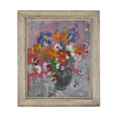 Still-life subjects were an enduring area of interest for Redpath, and as these examples demonstrate, colour and texture were of the utmost importance in her compositions. In her travels as an art student she had admired the dry, flat quality of frescoes in Siena and spoke often of how powerful an influence she found the white-washed walls of her Mediterranean accommodation. Redpath was also interested in the relationship between two and three dimensions and the decorative quality of compositional elements; often flattening perspective, depicting assemblages from a high vantage point and converting featured objects into decorative compositional components, as with the red chair in A Still-Life of Spring Flowers, which becomes areas of pure textural colour.
