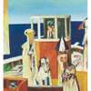 Like these artists before him, Bellany used visual symbols to represent and allude to moods and messages within his work. In Sea People, for example, he combines the traditional artistic motif of the dog - representative of matrimonial fidelity - and the owl - a cipher for wisdom -with his own invented stock of imagery. This includes a puffin's colourful beak, and a black-eyed and somewhat sinister seagull. They occupy the narrow deck of a fishing boat, sailing on an ominously still, intensely blue ocean. The captain of the ship, his face half obscured, bears a resemblance to the artist himself, and something or someone appears to be wearing the façade of the seagull as a cloak. It was painted in the early 1970s, a point when Bellany was increasingly reflecting on the human condition. In these monumental works, the ship represents our voyage through life to death. Deliberately impenetrable and oblique to the viewer, his paintings hold both deeply personal meaning whilst simultaneously hinting at more universal issues including fate, sex, guilt and death.