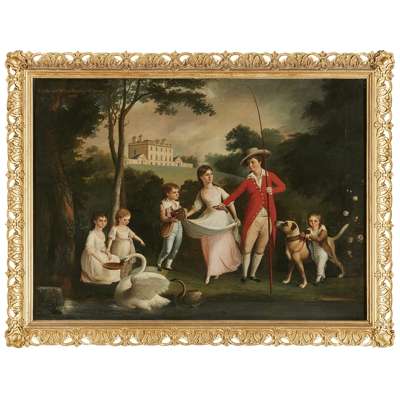 Nasmyth had begun his career as a portraitist with a palette of blues, pinks, lilacs and purples and an attention to fabric and texture, which emulated that of his early master Allan Ramsay, with whom he worked in London from 1774 to 1778. His earliest portraits were principally of single sitters, but from 1780 Nasmyth began to paint groups in the manner of Zoffany, notably The Duke of Atholl and his Family of that year and Patrick Miller and His Children, dated to 1782, the same year as the Barnton painting. Nasmyth prefers to place his groups in a pastoral setting, often with their residence in the background, as seen here and also in his portraits of the The 3rd Earl Rosebery and his Family in the Grounds of Barnbogle Castle (1784, Dalmeny House) and Lady Honyman and her Family (c.1790, National Galleries of Scotland). Revealingly, Nasmyth is at pains to create a sense of realism in these works, placing them in the context of an actual event, generally the return from a shoot, a pony ride or, as so charmingly depicted here, from a successful fishing expedition.