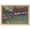 Paterson also favoured complicated compositions; Winter, Moniaive being a classic example. Paterson had his studio on the banks of the river outside the village and regularly used it as a device to draw our eye into and through his paintings of the area. His work is characterised by a relative coolness of palette, as well as an interest in the decorative possibilities of compositional structure.