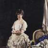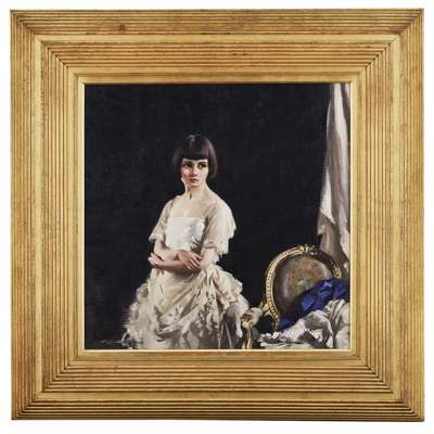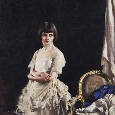 The portrait shown here from 1922 and titled The Lace Frock, depicts one of the artist's favourite models, Poppy Low, standing to the left of a chair on which curtains and purple fabric are casually draped. The model's bobbed haircut portrays her as a modern woman and the ruffles on her lace dress demonstrate the painter's skill with the fabric. We see similarly fashionable depictions of Poppy Low in Cursiter's Roberta (Blackburn Museum and Gallery; 1921) and A Summer Night (Private Collection; 1923).