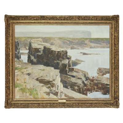 The Orcadian landscapes offered here, such as the 1954 canvas An Island Farm, Oddness, Stronsay, demonstrate both his profound emotional attachment to the area and the influence of the French avant-garde on his work. In particular, this piece displays an appreciation of the work of Cézanne in the use of broken brushstrokes. Cursiter employs Cézanne's ground-breaking technique to suggest the texture of the rocks in the foreground, which emphasises the warm middle-ground that recedes into the colder colours surrounding it, and allows Cursiter the opportunity to show his immense artistic talent.