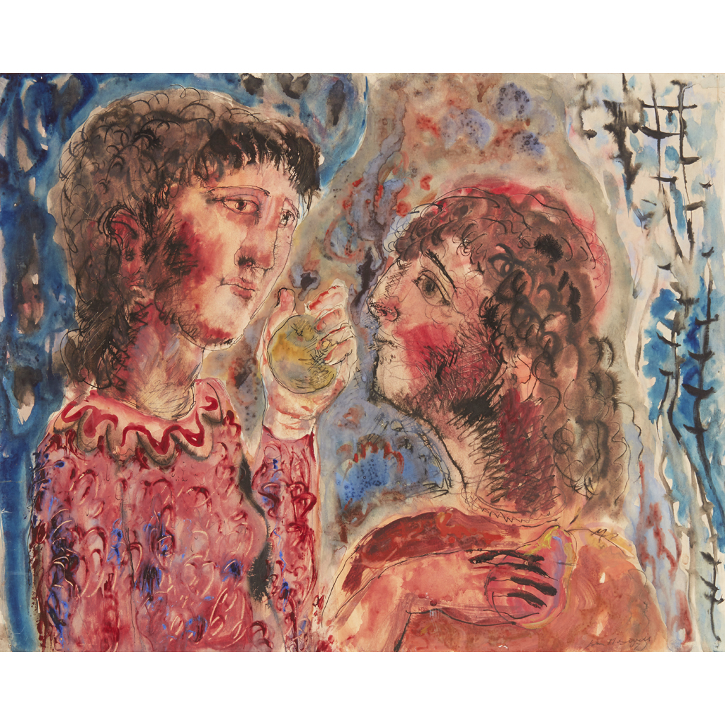 In the work offered here for sale, Figures with an Apple, Maxwell's distinctive mix of pen and ink and watercolour is used to create a dreamy, poetic image. The subject of a male and female figure holding an apple is relatively straightforward, but as in many of his works, it is Maxwell's imagination and approach that imbues the work with a mystical and symbolic quality.