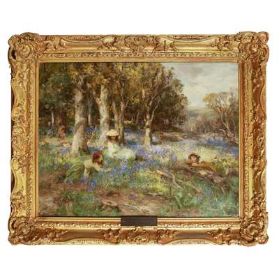 It is believed that MacGeorge's predilection to gloomy colours - possibly the Hague School influence - was challenged by Edward Hornel, who encouraged MacGeorge to soften his tone, thus making his paintings much brighter, his brushstrokes more richly imparted, and his painting style considerably more decorative. However, MacGeorge always maintained a substantial level of individuality in his artistic approach, in particular, a truth to natural forms. His most prominent works transmit naturalistic atmosphere enhanced by vigorous brushwork and bright spots of colour. Although MacGeorge's choice of subjects was extremely diverse, his signature setting is a woodland scene with children playing among the flowers. The present work, The Blue Haze of the Hyacinth, belongs to a large series of works depicting utopian idylls. Here the artist portrays three young ladies resting in a meadow filled with azure bursts of wild hyacinth. An example of MacGeorge's colouristic approach, the work presents a vivid impression of a bright summer day, as well as the artist's signature impasto brushwork.