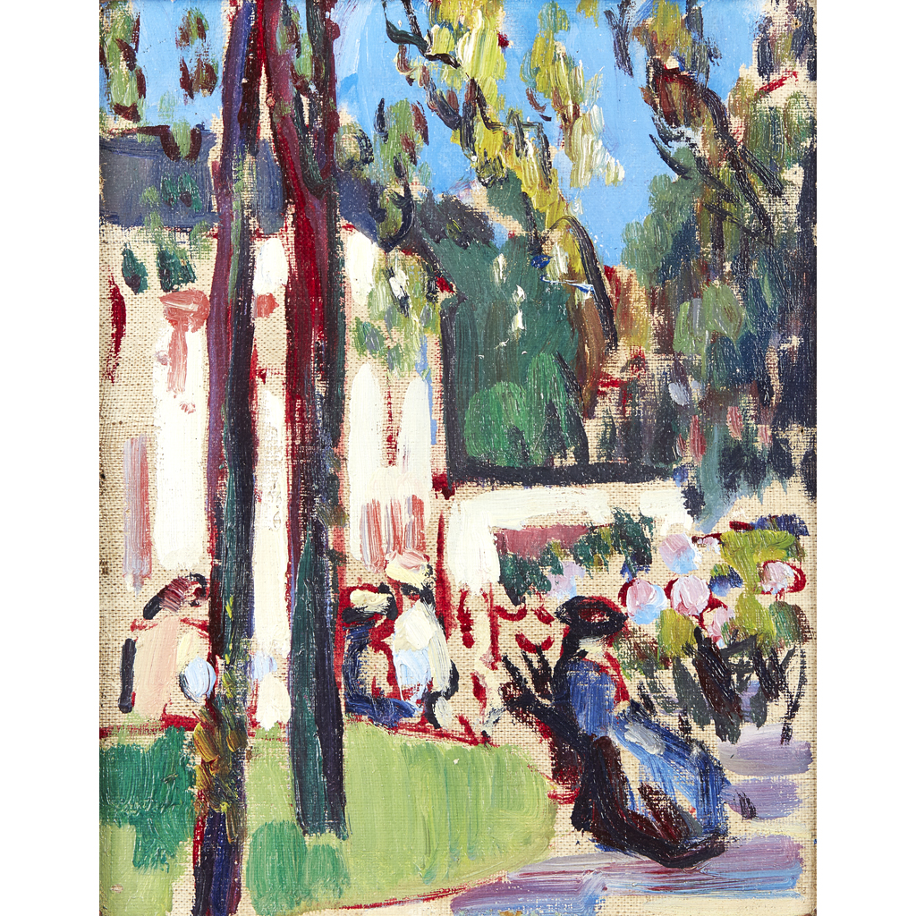 Fergusson's increased confidence is clear in Woman on a Bench; in the fluidity of the handling and boldness in leaving areas of the canvas bare, offering a delightful contrast between the regular, rough texture and sandy linen colour of the visible canvas and the fluent application of bright toned oil paint. The viewer is at once transported to this moment of observation in the Luxembourg Gardens, and simultaneously viscerally aware that this is an artist's production, and his particular vision of such a moment.