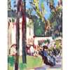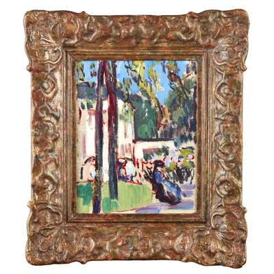 In his French oil sketches, his palette became more vibrant, as seen in the verdant green and azure blue of Women on a Bench. Fergusson was heavily inspired by the Fauvist movement and their use of shockingly strong, complementary colour pairings. His interpretation of this approach is most visible in his elegant female portraits, but it is also apparent in the contrasting colours used in the lush palette here, the red and burgundy details lifting the green tones. Close observation reveals a wonderful range of hues, making it clear how he earned his name as a 'colourist.'