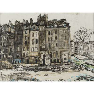 In Houses, Paris, Eardley takes a more typical viewpoint, depicting the structure of Parisian apartments, revealing their distinctive character, and intriguing the viewer as to what lives and dramas may be occurring inside. The work unfolds across two pieces of paper that the artist has joined - a typical action of Eardley, and an adaptation that only adds to the appeal for her collectors. She was a committed artist, who took her work very seriously, yet she rarely became precious about the condition or approach of individual pieces, happy to add extra expanses of paper when required, or work loosely on the rough texture of sandpaper, to stuff sketches in drawers where they gained additional tears and textures. When working in Catterline, she would even go so far as to leave her large oil works outside, subject to exposure to the elements, feeling this experience improved rather than ruined her art. Houses, Paris is mostly worked in shades of brown and grey, exactly as we would expect, yet Eardley is able to lift and energise the composition with flashes of bright blue and green.