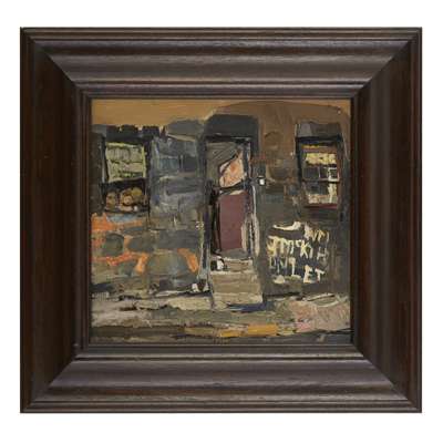 In Glasgow Tenement with Grafitti, it is a delight to see Eardley working in oil to capture the vivid texture and palette of a Glasgow tenement. She has cropped the scene so specifically, and worked so loosely, that it takes the viewer a moment to adapt and recognise what they are seeing. As the subject comes into focus, we are drawn to the details - the strikingly graphic graffiti, the little heads peeking through the window, the cat curled up on the steps - that reveal the community and life inhabiting this dilapidated building. It is a strikingly accomplished artwork, and a visually powerful image, yet it also works as an historical record of a community way of life that Eardley knew, even as she was painting, was coming to an end.