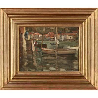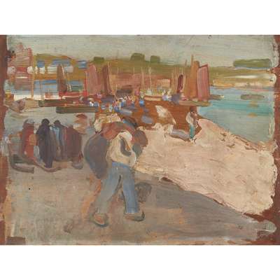 Oil on panel, also painted verso 'Fishermen on the quay'