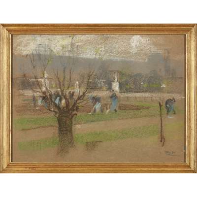 A Scottish artist, with a particular European flair, Brough's modern French training combined with a range of influences and inspirations from Raeburn to Velazquez to create a sophisticated and flamboyant approach. Close engagement with the selection of offered works by this intriguing artist reveal his true talent and dexterity; his lightness of touch and sophistication across mediums particularly apparent. Rowing Boats by a Harbour Quay, Concarneau atmospherically evokes the Brittany coast and the quick, deft brushwork is handled with a charming lightness. An unfinished working sketch still visible verso reveals the artist's working practice. In Rowing Boats, and Figures on the Harbour Wall, Brittany, Brough beautifully balances the compositions and utilises the unique qualities of the differing mediums. Within the offered group a particular preoccupation with ripples and reflections is visible, elegantly captured by the artist in a variety of media, from directly applied waving lines of pastel pigment to a patterning of daubs of fluid watercolour. Overall it is his dexterity with pastel that is a true delight to witness, with his lightness of touch allowing him to delineate the patterning of architecture and greenery in South of Concarneau, the colourful, graphic topography rising elegantly out of the buff paper surface, and the sparseness of a Parisian winter in Bulb Planting in the Tuileries Gardens, Paris, the effortful gestures of the workers clear in their brief outlines and the elegance of the city visible in the grey and white distance.