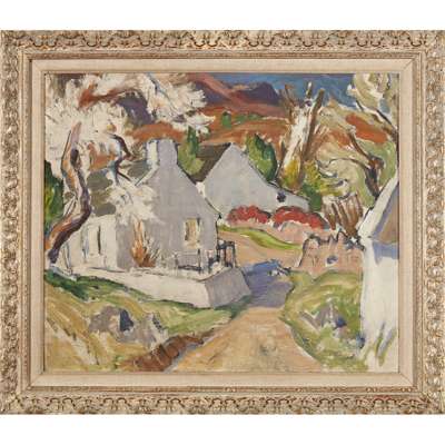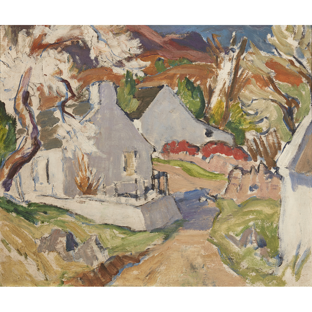 His ties with Scotland remained strong, and ultimately he was to settle on the Isle of Arran, making his home near Corrie harbour. The effect of the brilliant French light never deserted Milne, and his depictions of Arran are virtually always of idyllically bright days, featuring white-washed cottages, wind-ruffled blossom trees and turquoise bays. Milne's form by this period is often experimentally free and unfettered; the foliage and proportions of the house almost swirling with movement and expression, alluding, perhaps, to the work of one of his greatest influences, Vincent Van Gogh.