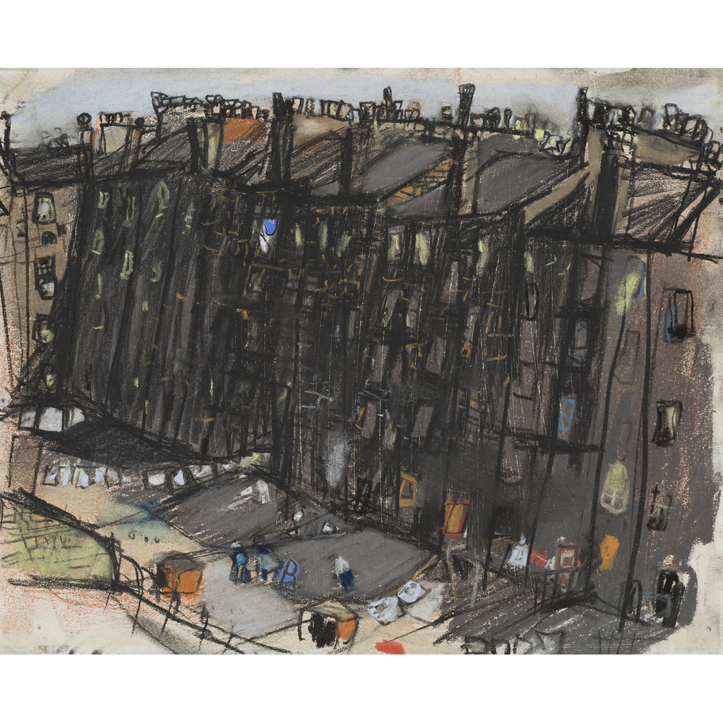 A further four of these artworks take us to the east end of Glasgow, Eardley's other home, and an area that greatly inspired her artistic work. Most famously she worked on a series of sketches of the local children, encouraging them to sit for her in exchange for sweets and comics. Predominantly worked in pastel, here we have an oil sketch of a girl in which the deft brushwork reveals the artist's talent as well as her enduring affection for her subject. In the other offered East End works, Eardley focuses on the structures inhabited by her sitters, boldly capturing the slanting lines and everyday details of this way of life in both pastel and oil. Eardley's colour choices enliven the details amongst the bold dark lines and sections of dense pigment in A Glasgow Tenement, delineating windows in citron and orange and lines of drying laundry in a pale blue-grey. The vibrant colour and energetic brushwork of Glasgow Tenement reveals the beauty Eardley found in this ordinary street, and the specific vitality she saw in the area. This was a way of life that was quickly disappearing, as we can see in Tenement from Wasteground, where the buildings rise beyond the abandoned area we view them from; the building we see will soon go the same way. The communities here live side by side with emptiness and dirt, and Eardley communicates these rough edges but also the joy and connection that she experiences there.