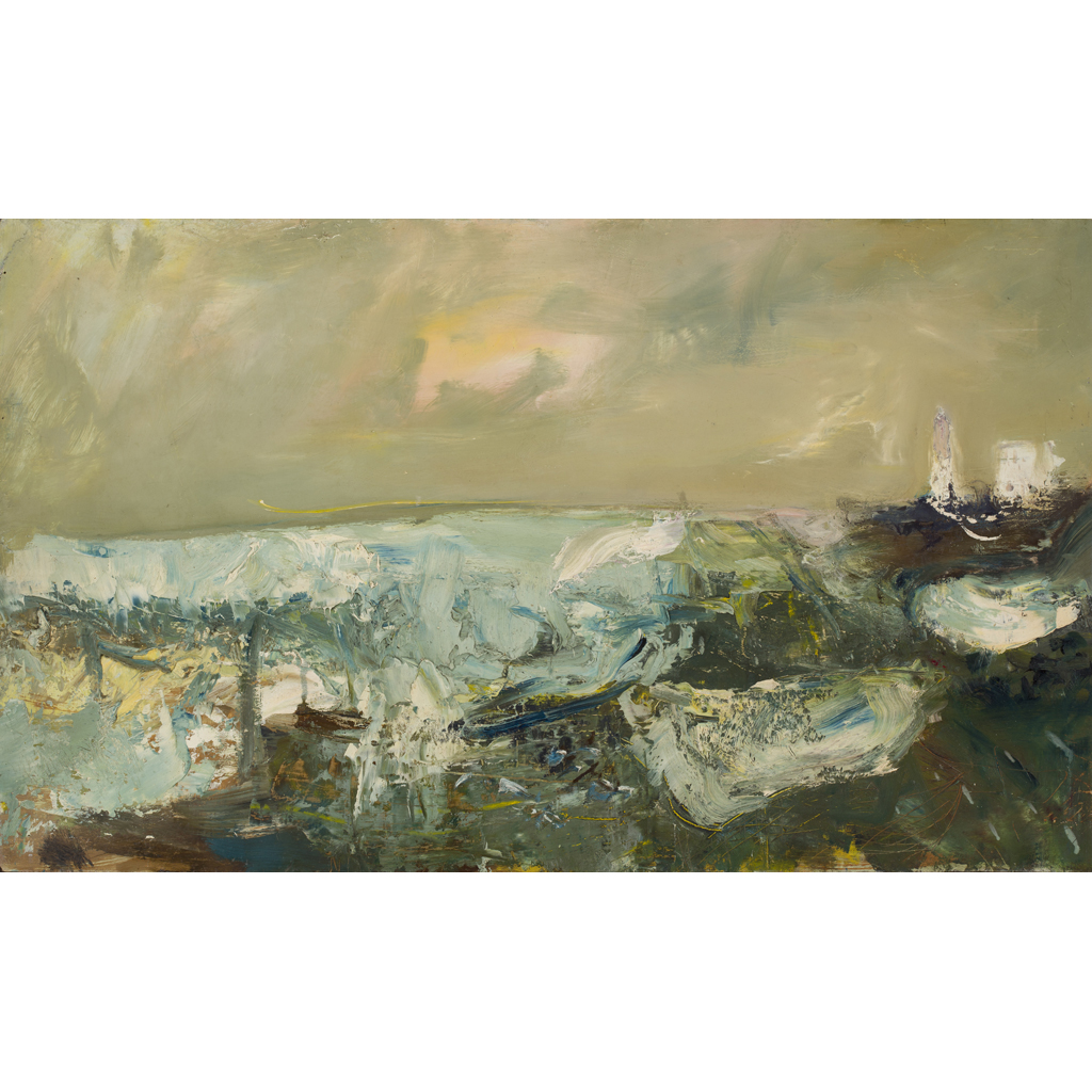 The Tod Lighthouse, Catterline, offers a spectacular view of Eardley's beloved home on the north east coast of Scotland, just south of Aberdeen. The wide-angled view takes in the lighthouse to the right, and runs across the offing, below which Eardley's exuberant, expressive brushstrokes convey the tumultuous, crashing energy of the waves. The primal power of the sea is expressed, and we are drawn into the materiality of her paint, as we are drawn to the enduring eternal rhythms of the sea. A similarly vibrant, dynamic painterly approach is visible in A Harvest Landscape, Catterline, where Eardley turns her energetic brushwork and dripped paint inland to the rich, warm colour and texture of this abundant season. As an exciting extra, this work features a small, signed still-life study verso, in an unusually cheery pink palette.