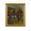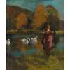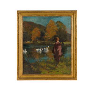 Note: Glasgow Boy artist George Henry painted some of his most successful compositions in Galloway, having been encouraged to try painting there by his close-friend and artistic collaborator Edward Atkinson Hornel. The two artists also travelled together to Japan, spending eighteen months exploring, learning and innovating their individual painting techniques in response to their discoveries there. A quintessentially elegant scene by Henry, ‘Autumn by the Lake, Galloway’ deploys some of the key features of his celebrated approach: rich colour, and a slight flattening of the picture plane, to allow for more focus on the decorative effects of colour and pattern. Our Edwardian lady with her russet hair and draping cloak appears gazing out over a serene lake, her elegance mirrored in the bevy of swans, with their gracefully arching necks, gliding across the gentle pool. The late afternoon autumnal colours are rich and warm, with the oranges and greens offset by the rippling cool blue of the water.