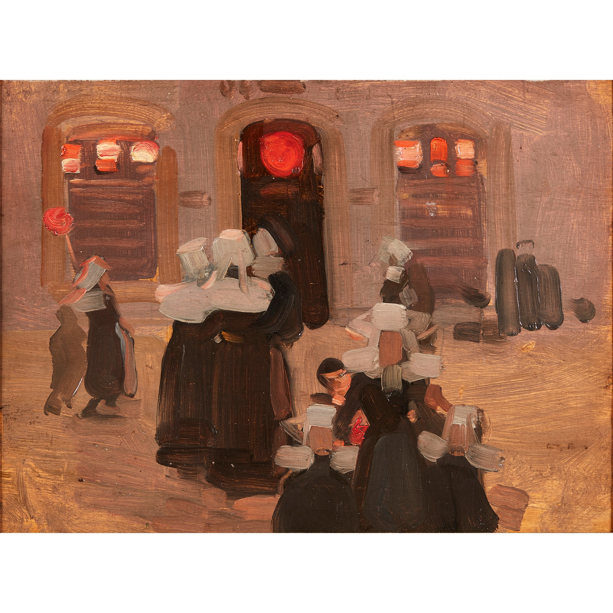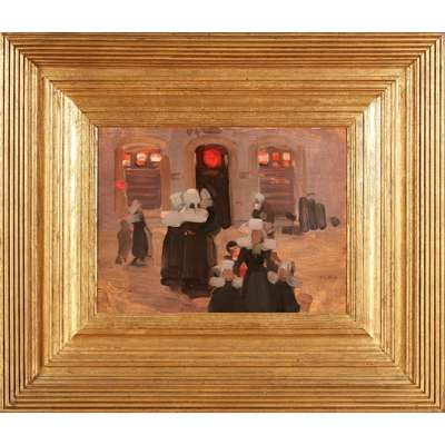 Close engagement with the offered works by this intriguing artist reveals his true talent and dexterity; his lightness of touch and sophistication across mediums particularly apparent. ‘Breton Women by Street Light’ is an atmospheric oil sketch, as Brough depicts the transient nature of early evening, as the light starts to glow through the windows, and skilfully captures the distinctive way that the white lace coiffed headdresses of the Breton women pick up touches of this reflected light. Brough achieves this with consummate ease, the paucity and economy of brushstrokes letting ones imagination fill in the gaps. The painting was included in the Aberdeen Art Gallery & Museum’s 1995 exhibition devoted to the artist. In ‘Herd Girl,’ Brough reveals his ability in pastel, a tricky medium. The beauty of the girl is softly and deftly captured, while the brighter colours of the distant landscape seem to almost swirl around her, though highlights of these richer tones are picked out in her hairband; harmonising the figure with her surroundings. Brough creates a rich, warm surface to the work, smudging the pastel in certain areas, but leaving his gestural pigment lines visible in others, creating a striking and unusual contrast.