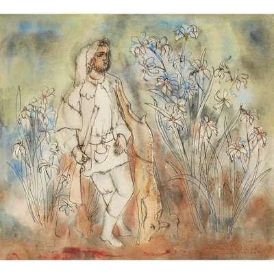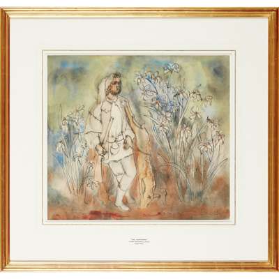 As with poetry, there is a sense that each work evolved organically during its making; a process articulated excellently by the artist David McClure in his preface to Maxwell’s monograph of 1976, when referring to work offered here for sale: “Often his pictures seem to begin from an observed reality, but during the process of painting, this reality becomes transfigured by his own particular alchemy…. What started out as a drawing of a Staffordshire figure becomes, as in the watercolour The Hunstsman II, a pastorale. The hunter, the slain deer hanging from his shoulder, stands in a mysterious wild garden full of out-size flowers.”