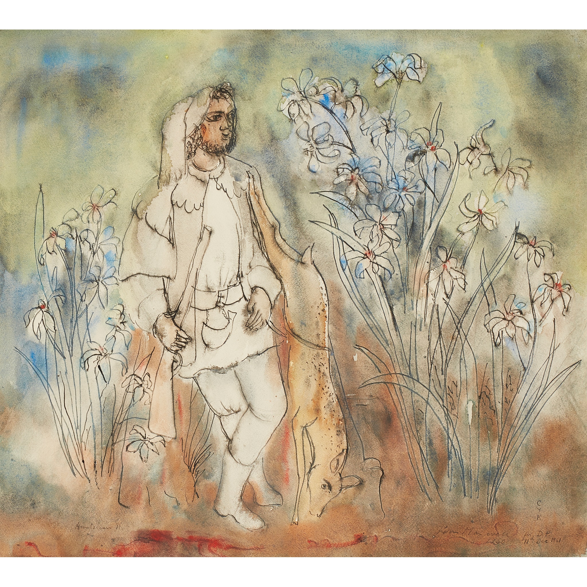 Signed and dated 1940, inscribed and dated 'C.Y.K. for D.P. 11th Dec 1941', pen and ink and watercolour