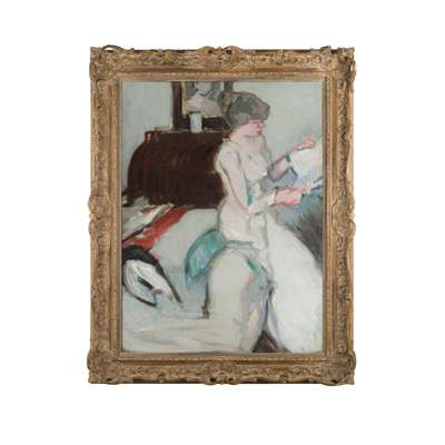His model is not formally posed; rather captured at leisure in her home, casually reading her paper while perched on the arm of a chair which is itself strewn with an un-styled tangle of fabric. The loose brushwork is by turns subtly daubed and dashingly emphatic. J D Fergusson once commented of the pair’s early work: ‘Manet and Monet were the painters that fixed our direction.’ Here we see Peploe embracing Manet’s truth to modern life with his domestic setting featuring a fashionable young woman, and Monet’s freedom of handling and sense of the fleeting and transitory. Though admired and commercially successful, Peploe would only paint in this manner for a few short years, before making the move fulltime to Paris in 1909 where he was to fully embrace the style (and accompanying controversy) of the Fauves.