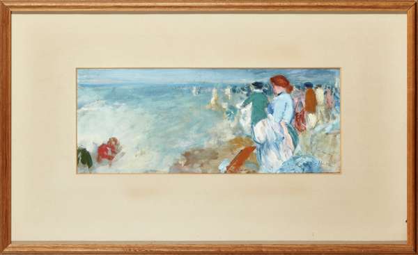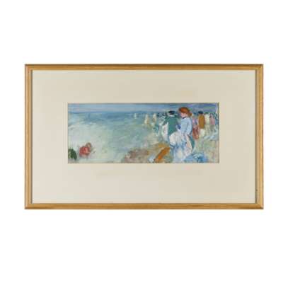 Lyon & Turnbull are pleased to present two examples of work created on Hunter’s second trip to Étaples in 1913. Smith, who illustrates ‘On the Beach’ in his book, notes that the influence of Cézanne is strongly evident in the handling of the paint and the marked lightening of his palette, praising the ‘freshness of the sea breeze. . . (and) sense of bustling movement.’ These works are among the first notable evidence of this important shift; the absorption of Post-Impressionist tendencies that were to become signatures of Hunter’s work. Here, nature is no longer approached with naturalism as the priority, and instead broad, fully-loaded brushstrokes are utilised to highlight the intrinsically decorative patterns created by the shapes and forms of the shoreline and its visitors.