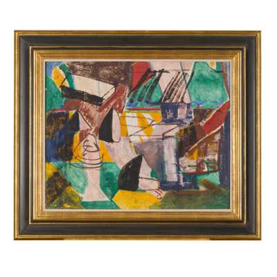 In 1925, he left for Paris on a travelling scholarship awarded by the Royal Scottish Academy and studied in the city for two years, with the occasional trip to Spain, Italy and North Africa. Like many other Scottish artists in Paris, Johnstone chose to study under André Lhote, the distinguished French Cubist painter. In his studio, Lhote taught a different kind of Cubism- one which integrated an understanding and analysis of the Old Masters in relation to the modern style of Cubism. It was these teachings, combined with an awareness and exposure to the Surrealism prevalent in Paris during the late 1920s, that created the groundwork for Johnstone’s great abstract works later in life. His earlier work, such as Still Life by a Window, 1926, created during his time on the Continent, masterfully shows the blending of these distinctive styles. Johnstone’s almost academic awareness of space and shape is evident in the work’s composition, while his use of texture, wandering line and freer form simultaneously allude to the unconscious mind and the dogma of the Surrealists.
