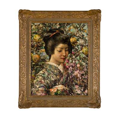 After studying art in Edinburgh at the Trustees Academy and then in Antwerp under Charles Verlat, Hornel returned to his home in Kirkcudbright in 1885 and began to paint the nature and inhabitants of the surrounding Galloway landscape. Lyon & Turnbull is delighted to offer a selection of works from this leader of the Kirkcudbright School. Japanese Girl with Peaches, inspired by his trip to Japan in 1893, shows Hornel’s concern with colour harmonies and texture, while his scenes of young girls in forest and seashore settings showcase his experimentation with form and an emphasis on subject matter. Hornel’s rich, playful colour palette and dappling light are echoed in the works of his Kirkcudbright contemporaries.