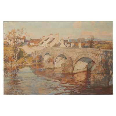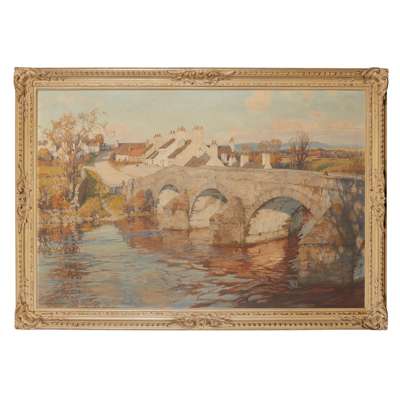 It is said that when the weather was dull, Charles Oppenheimer would fish, while on sunnier days he would spend his time painting. This impressive river scene captures Oppenheimer’s familiarity with, and affection for, the rivers around his Kirkcudbright home. The composition was painted from the riverbank overlooking the Bridge of Dee, Galloway, a charming scene that remains virtually unchanged today. Oppenheimer preferred to work with a warm palette to evoke the characteristic pale golden light that so often illuminates his paintings, qualities that are exemplified here. This painting was amongst the sixty-one exhibited by Oppenheimer at the Royal Academy, and demonstrates his broad, expressive brushwork and sensitive approach to his subject-matter.